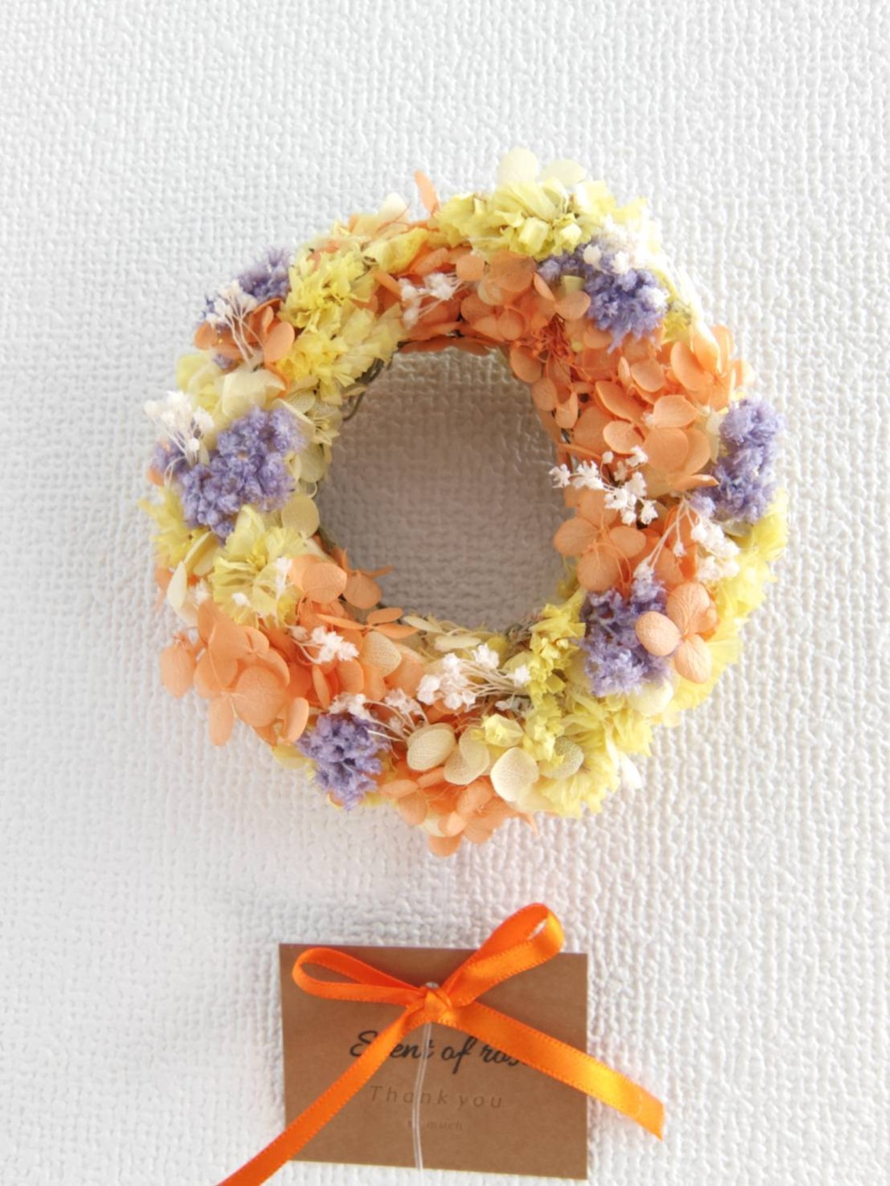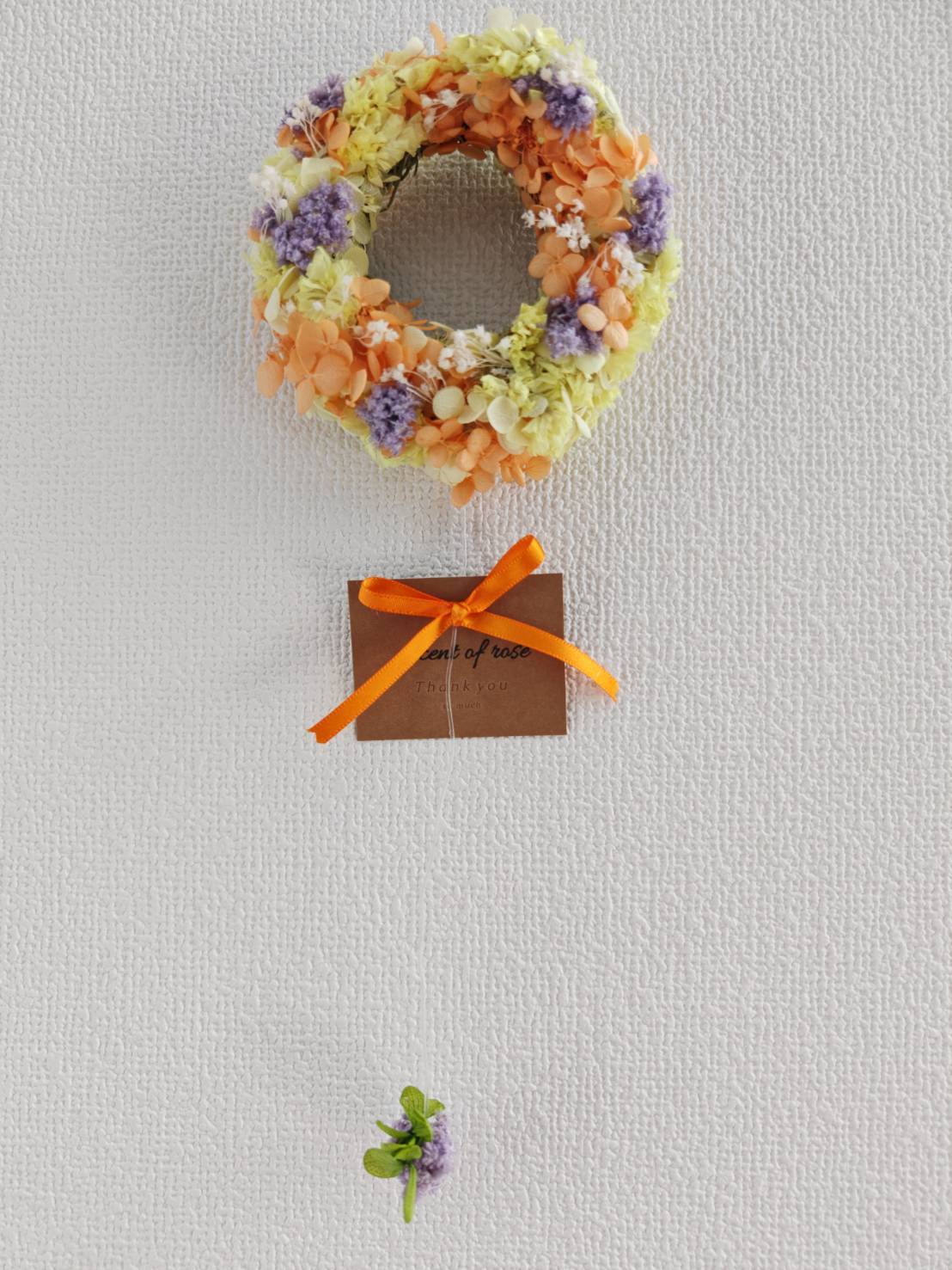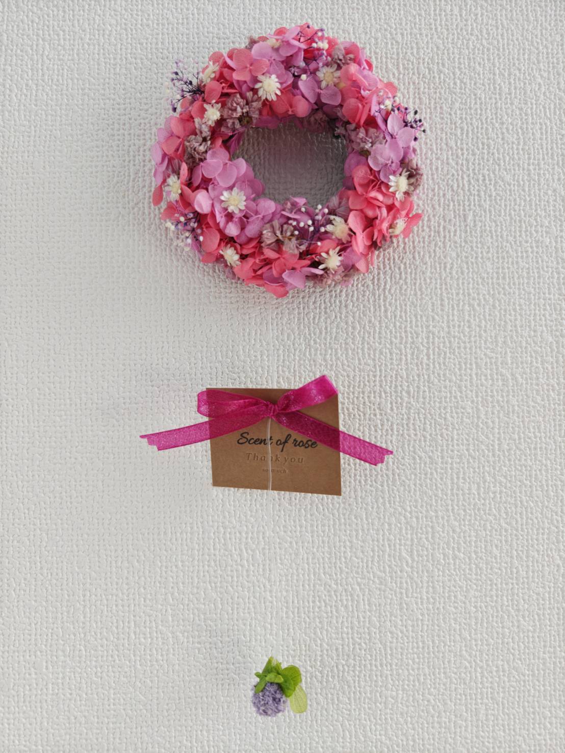 手のひらサイズのリースの下につながったリボンと、ゆらゆら揺れるお花が可愛いミニリース。