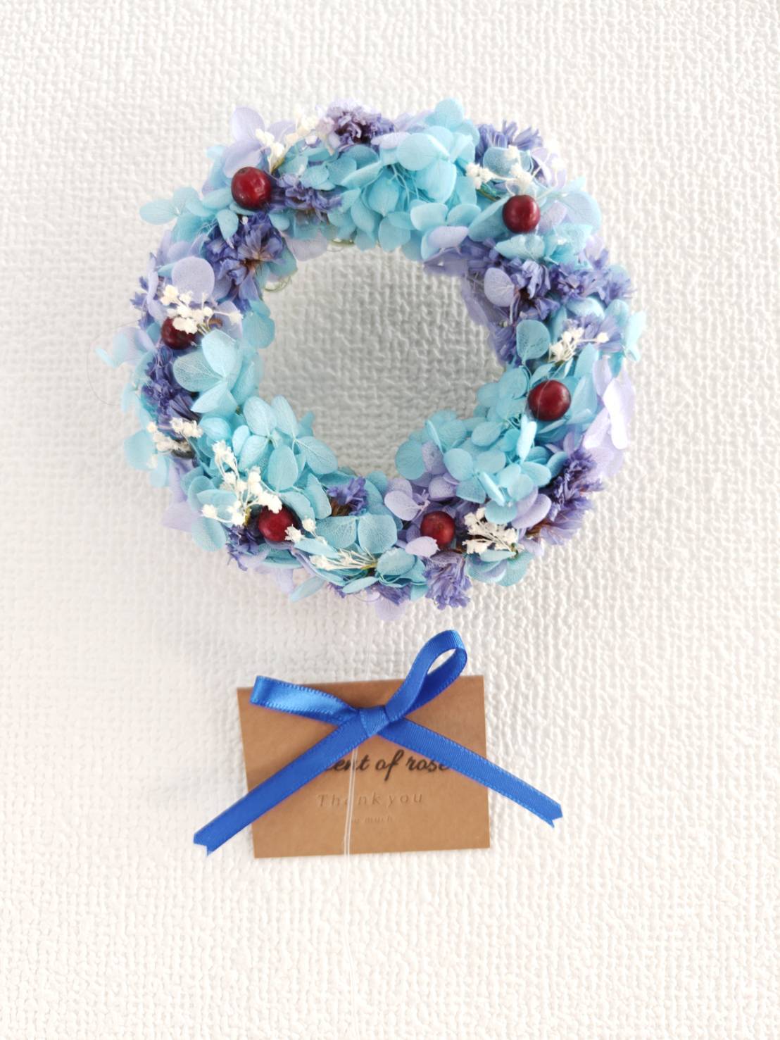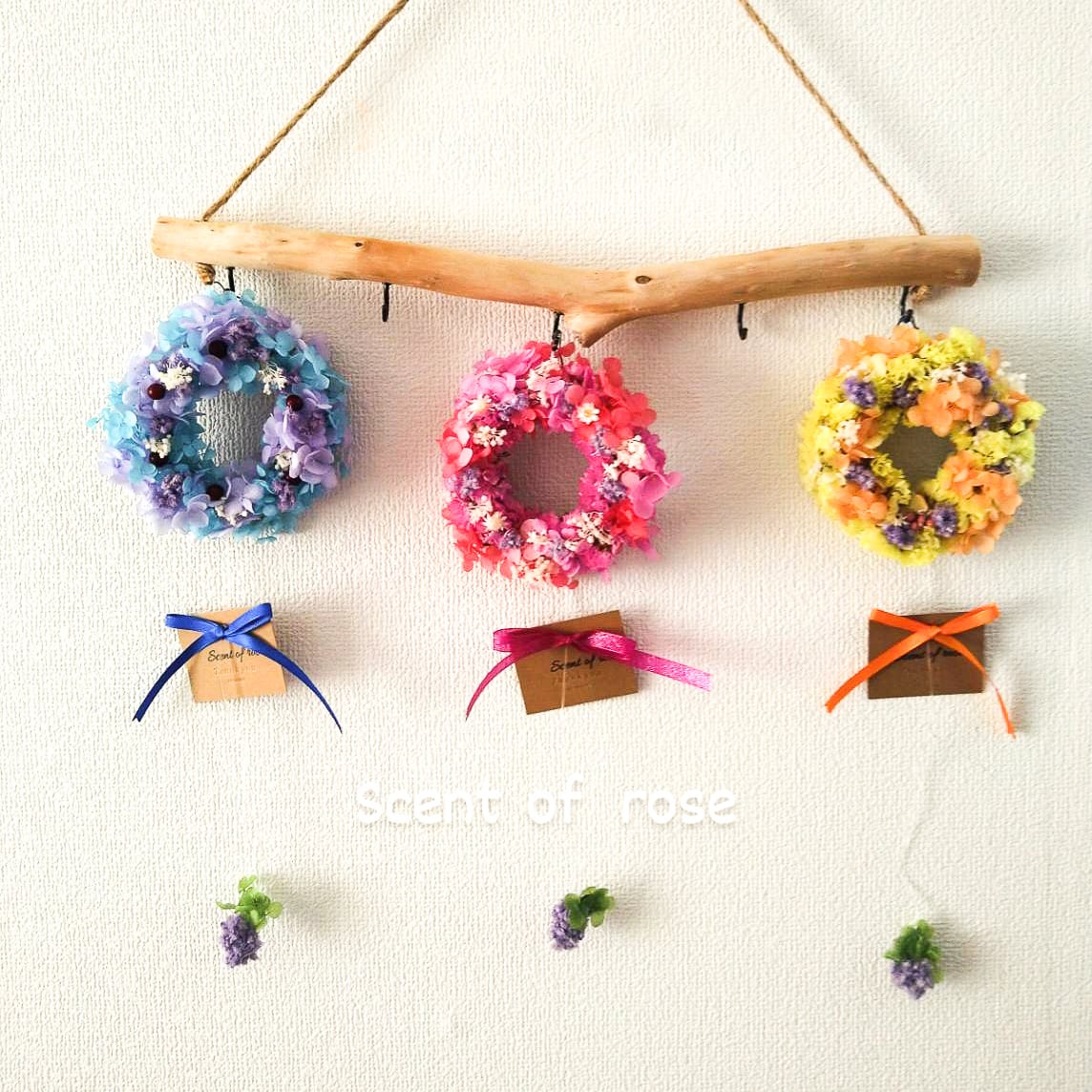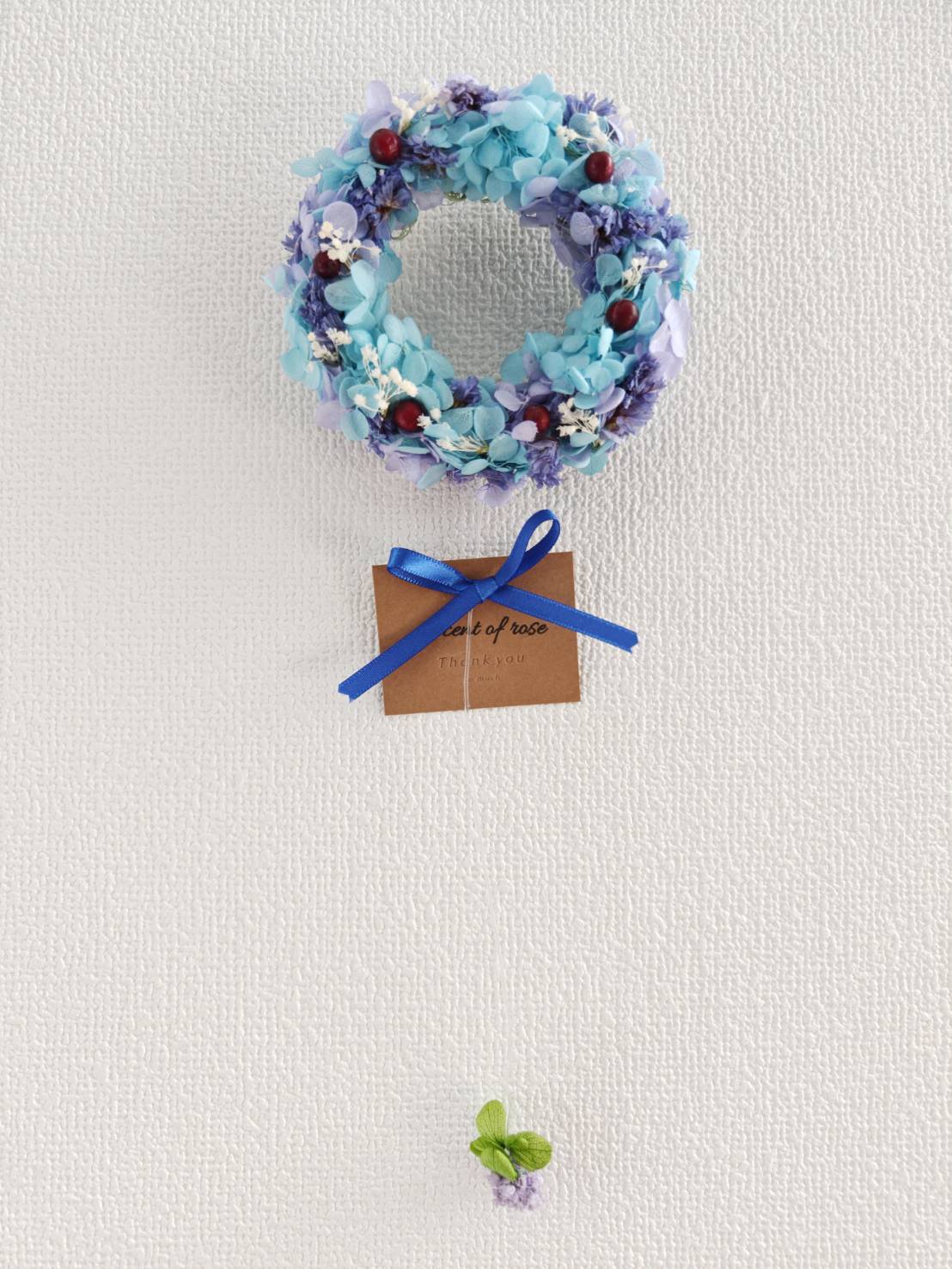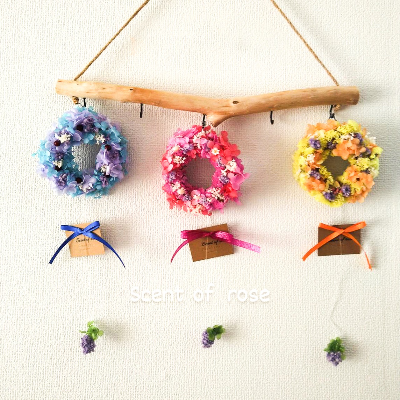 手のひらサイズのリースの下につながったリボンと、ゆらゆら揺れるお花が可愛いミニリース。