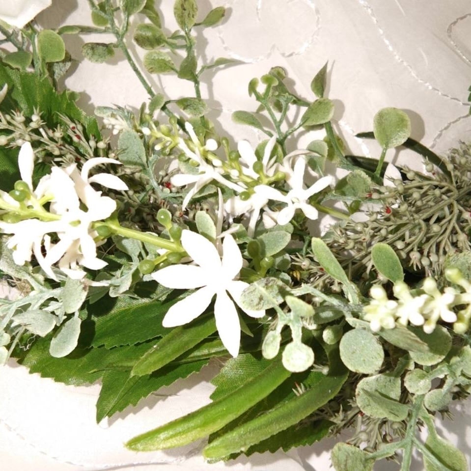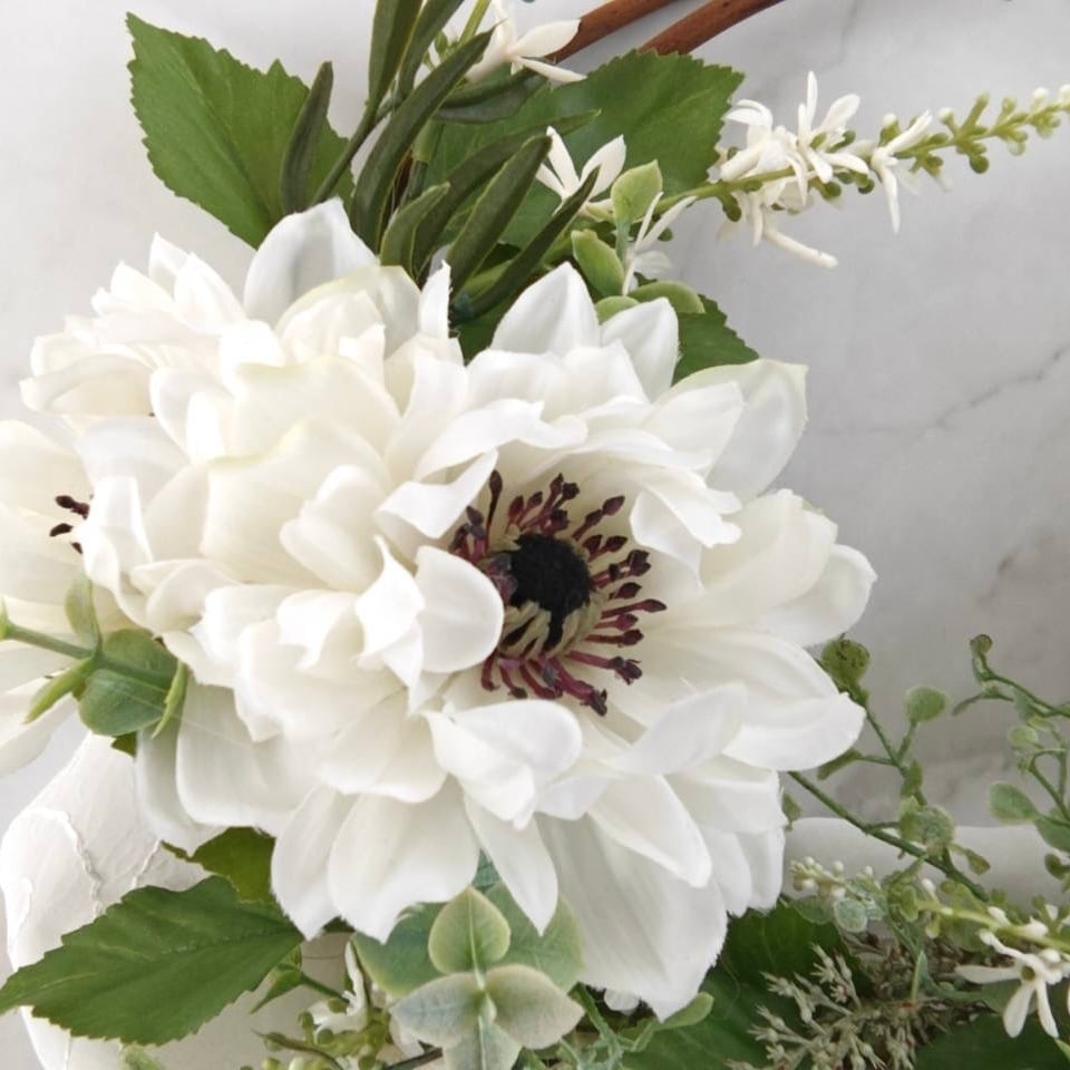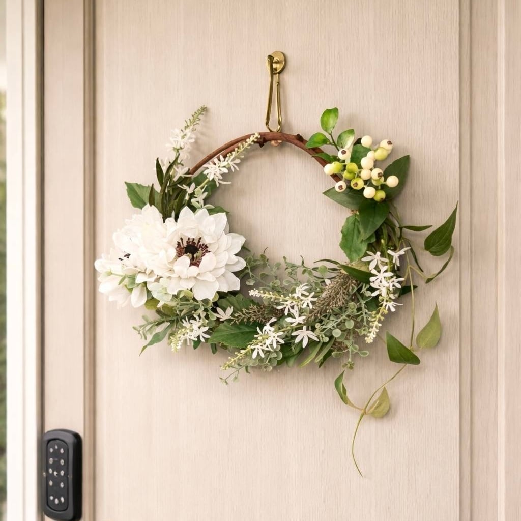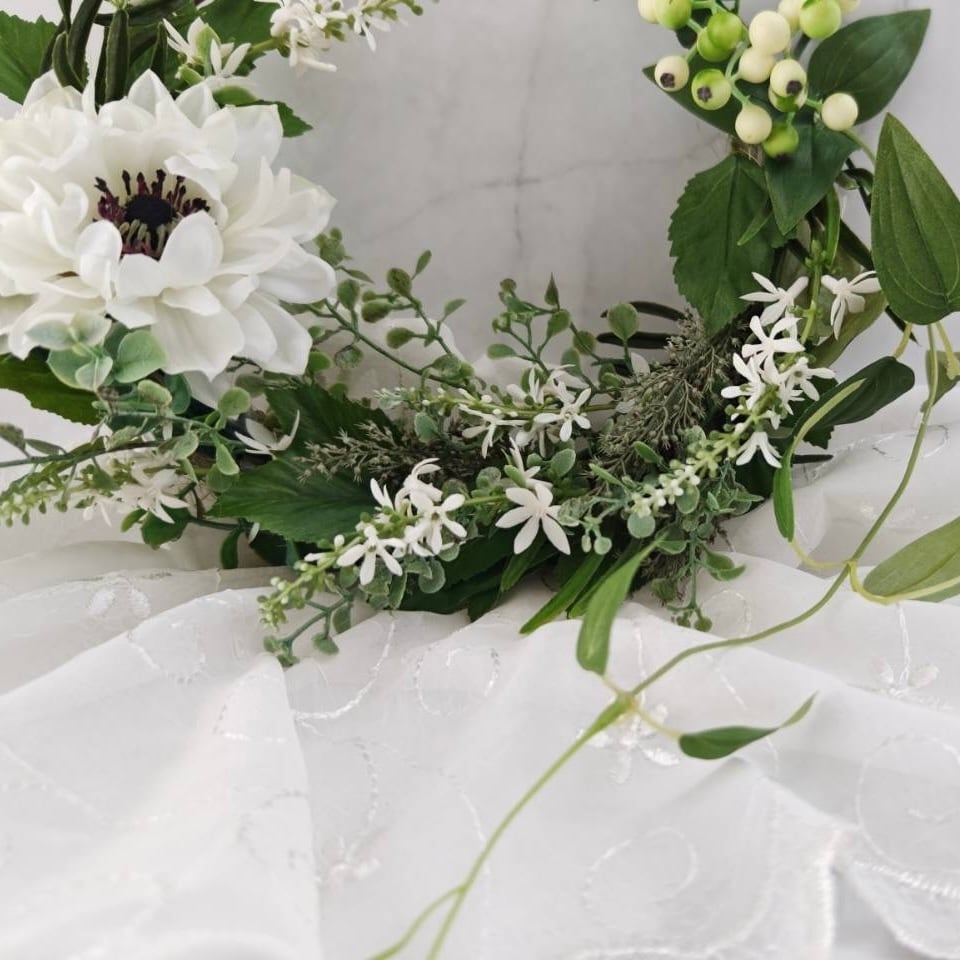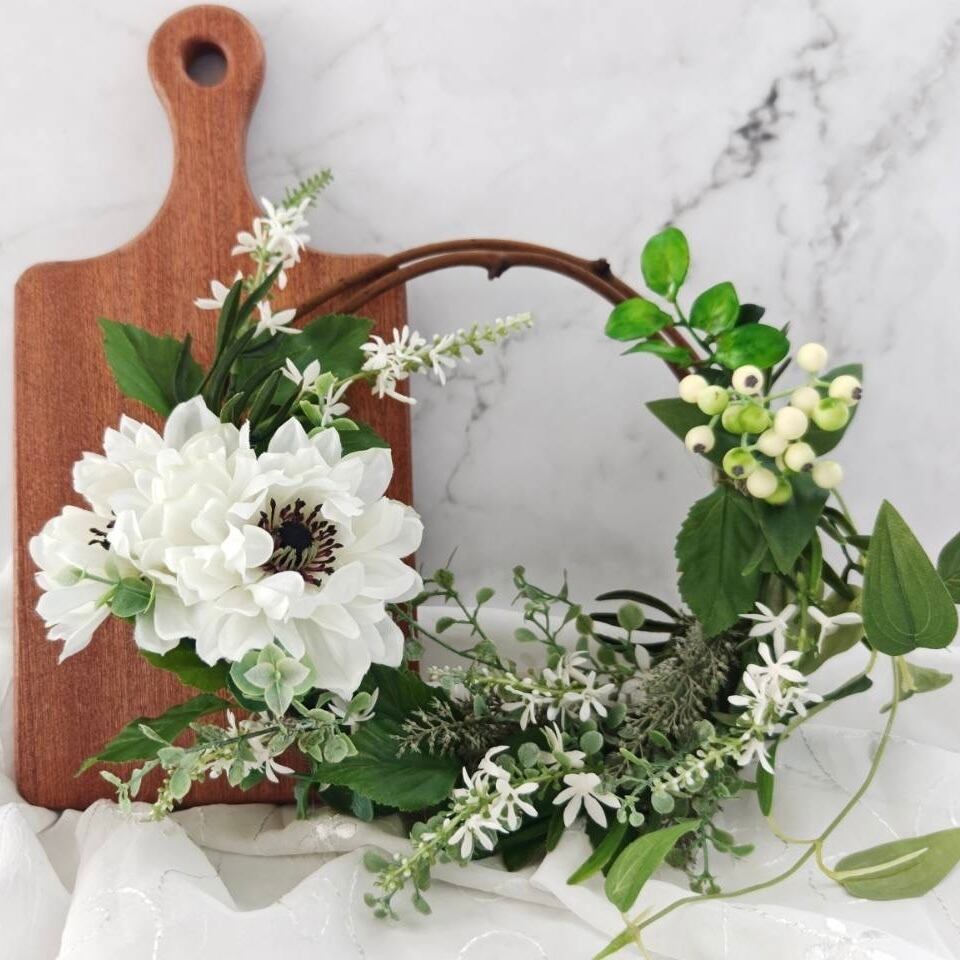 玄関に柔らかな動きを添えるアネモネとベロニカのリース