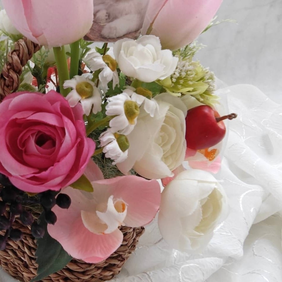 ご希望により、写真データをお送りいただけますと、ペットのお写真をお花の中に飾ることができます。