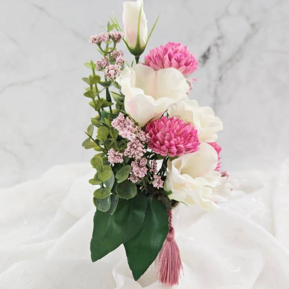 真珠のような白のトルコキキョウと柔らかく咲く明るいピンクのマム。